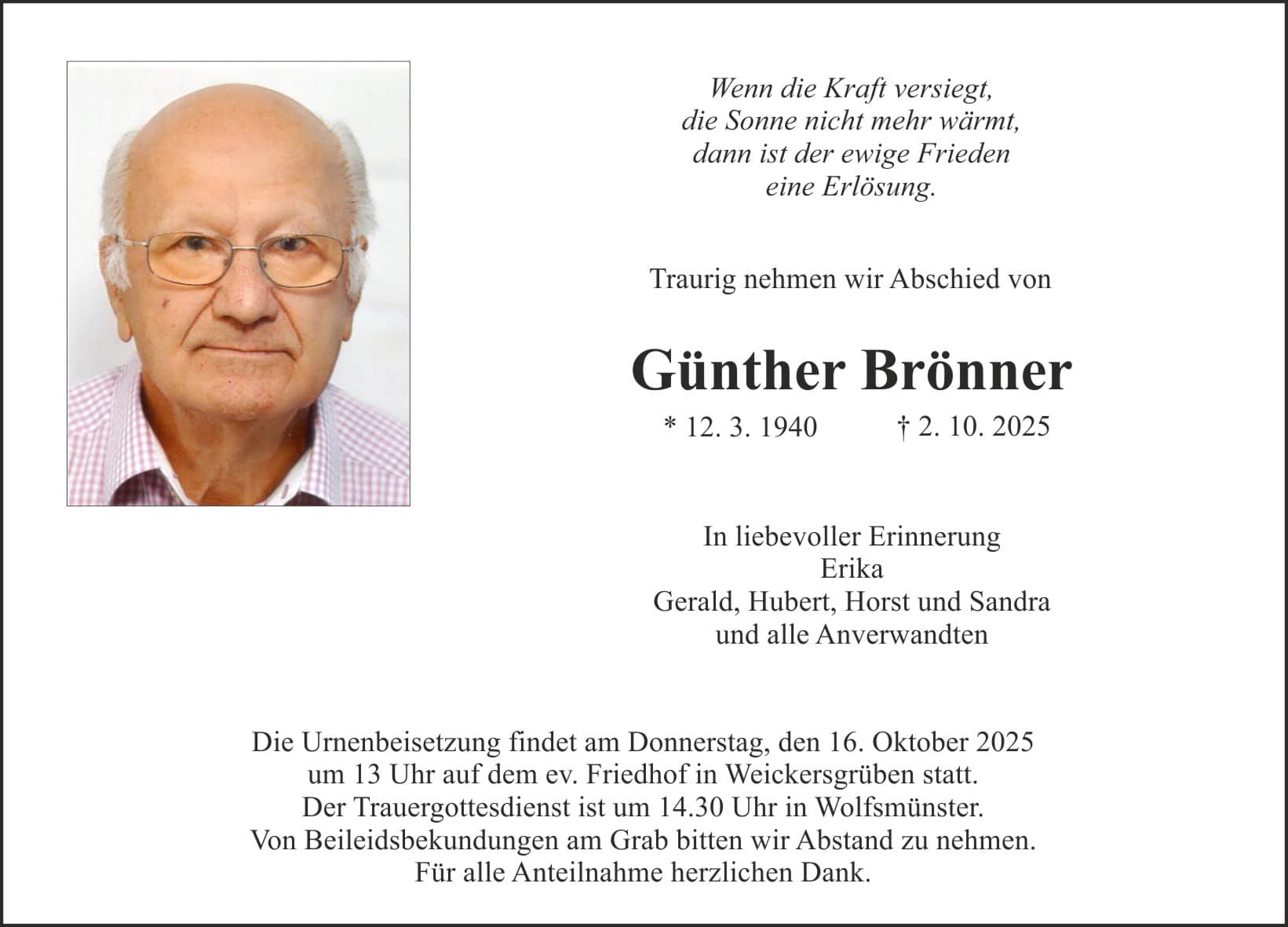 Beisetzungsart: Urnenbeisetzung in Weickersgrüben, 14:30 Uhr Trauergottesdienst in Wolfsmünster